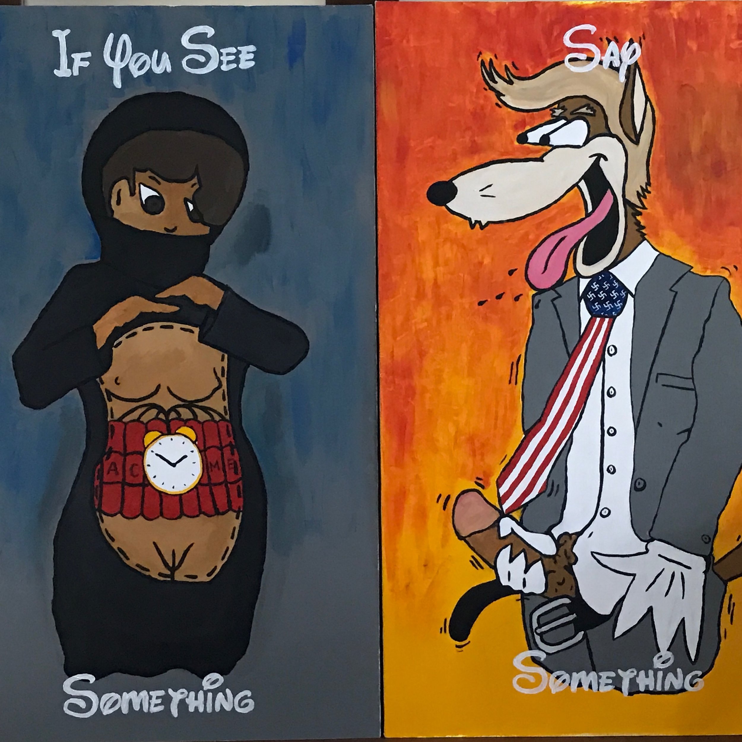 "If you see something, say something." This my election year art. I've been carrying around this idea for several years - that is to riff on the absurdity of the statement "If you see something, say something." I feel like it's a masturbatory fantasy for all of the security hawks that are out there painting this scary vision of the future. I wanted to embody that in old 50s cartoon wolf drooling over a woman in her burka, seeing through to a bandolier of T-N-T. With the emergence of Trump, it was a natural progression of this idea to target his xenophobic, misogynist, and racist messages.